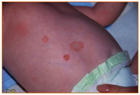 Neonatal skin lupus occurs in 5−16% of infants exposed to anti-Ro and/or anti-La antibodies. Exposure to anti-SS-B antibody and female sex are risk factors for developing skin lesions [82]. Dermatological lesions may be present at birth but also often appear during the first few weeks of life. Ring-shaped erythematous or polycystic plaque with or without scars characterizes NLE and appears mainly on the scalp, neck, or face. Periorbital erythema, referred to as ‘the eye of the raccoon’ or ‘the eye of the owl’, is a common feature. The prognosis for skin lesions is usually good. UV light can be trigger the development of lesions or can exacerbate existing ones [83]. Histologically, the lesions are similar to those of subacute lupus with hyperkeratosis, epidermal atrophy, basal degeneration, intracellular oedema, and perivascular infiltrations by inflammatory cells. In addition, direct immunofluorescence reveals complement and immunoglobulin complexes. Usually, skin lesions do not require therapeutic intervention, are self-limiting, and disappear with the disappearance of maternal antibodies in the fetal serum within a few months after birth. The enclosed photograph (Figure 1) depicts a neonate with skin lesions characteristic for neonatal lupus. The child was a patient at the Duchess Anna Mazowiecka Clinical Hospital in Warsaw.