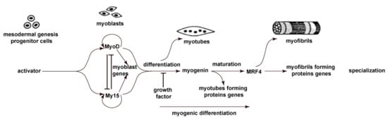 Figure 1. Transcription factors of myogenic differentiation and activation sequence. Reproduced with permission from Olson et al. [34]. Copyright 1994 Author(s).