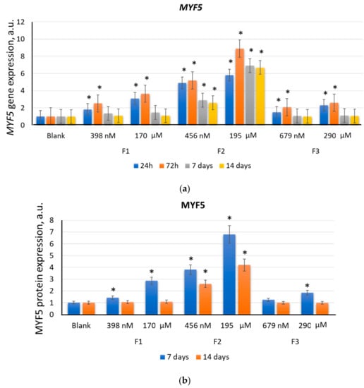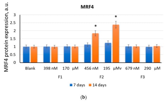 In line with the above, an increase in the MYF5 gene expression led to increased MYF5 protein expression. After 7 days of incubation with F1 at concentrations of 398 nM and 170 μM or F3 at a concentration of 290 μM, the MYF5 protein expression increased by a factor of 1.5–2.9 (p < 0.01). After 14 days, the MYF5 protein expression decreased to the blank level (Figure 4b). After 7–14 days of incubation with F2 at concentrations of 456 nM and 195 µM, the MYF5 protein expression increased by a factor of 2.5–4.0 (p < 0.01) and 4.0–7.0 (p < 0.01), respectively (Figure 4b).
