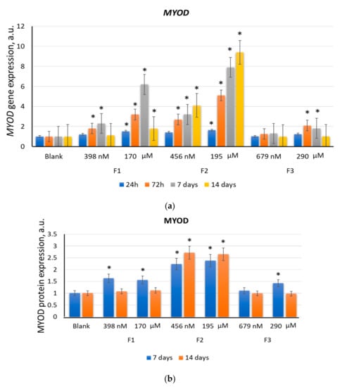 The MYOD1 protein expression increased by a factor of 1.5–2.2 (p < 0.01) after 7 days of incubation with F1 (170 μM and 398 nM) and F3 (290 μM). After 14 days, the MYOD1 protein expression decreased to the blank values (Figure 5b). As for F2 (456 nM and 195 μM), the MYOD1 protein expression increased by a factor of 2.2–2.8 (p < 0.01) after 7–14 days of incubation (Figure 5b).