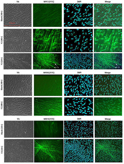 Immunohistochemical staining of MSCs with antibodies to MYF5 and MYOG after 14 days of incubation with F2 (195 μM), which induced the transcriptional activity of these genes the most, demonstrated an increase in the expression of MYF5 and MYOG proteins in the nuclei and cytoplasm of cells (Figure 8). Analysis of immunohistochemical staining of MSCs with antibodies to MRF4 after 14 days of incubation with F2 (195 μM) showed increased expression of the MYF5 protein in several cells that formed myotube clusters (Figure 8), which indicates the formation of muscle tissue [33].