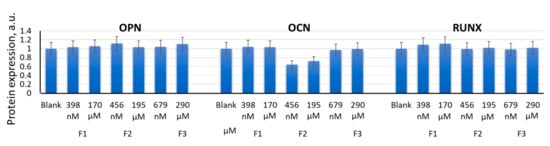 Figure 10. The effect of F1, F2, and F3 on the osteogenic differentiation proteins; the concentrations are shown in the figure. FL1 values were calculated for three experiments related to the blank. In blank experiments, cells were incubated without the fullerenes.