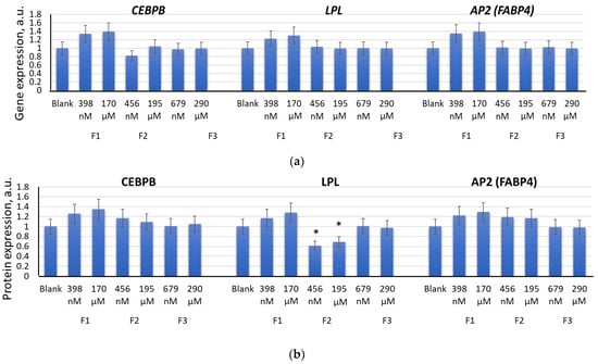 Incubation of MSCs with F1 (398 nM and 170 μM), F2 (456 nM and 195 μM), or F3 (679 nM and 290 μM) for 14 days did not result in significant activation of expression of either the adipogenic differentiation genes CEBPB, LPL, and AP2 (FABP4) [9] or the respective proteins (Figure 11a,b). After 14 days, incubation with F1 (398 nM and 170 μM) resulted in a slight increase in the expression of CEBPB, LPL, and AP2 (FABP4) genes, which may indicate either a switch of myogenic differentiation towards an adipogenic one or activation of adipogenic differentiation in a fraction of the MSC population. Fourteen days of incubation with F2 (456 nM and 195 μM) resulted in a significant decrease in the FABP4 protein, in parallel with an increase in the MYOD protein (Figure 5b).