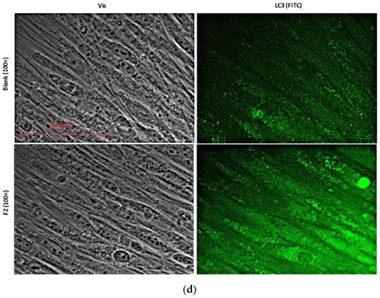 Figure 13. The effect of F1, F2, and F3 on the autophagy genes (a) and proteins (b); the concentrations of fullerenes are shown in the figure. The gene RNA amount was the mean value for three experiments related to the blank; the TBP gene was used as an internal reference gene; FL1 values were calculated for three experiments related to the blank; (*) denotes significant differences compared to blank cells, p < 0.005, in a Mann–Whitney test. Distribution of MSCs treated with F2 (195 μM, 14 days) according to the intensity of the antibody signal (c). Expression of LC3 (staining with fluorescein isothiocyanate (FITC)) 14 days after incubation of MSCs with F2 (195 μM) (d); fluorescence microscopy, 40×. In blank experiments, cells were incubated without the fullerenes.