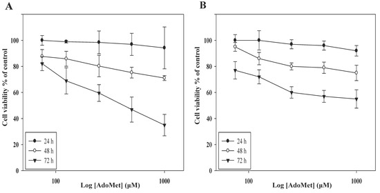 HCT 116p53+/+ and LoVo cells were plated in serum-enriched media in 96-well plates at the proper density. After 24 h incubation, the cells were treated with increasing concentrations of AdoMet (from 72 to 1000 µM) for 24, 48, and 72 h. Cell viability was assessed by adding MTT as previously reported [22]. The absorbance values of the solution in each well were measured at 570 nm using a Bio-Rad IMark microplate reader (Bio-Rad Laboratories, Milan, Italy). All experiments were carried out in quadruplicate. Cell viability was expressed as the percentage of absorbance values of treated samples with respect to the absorbance of the control (100%).