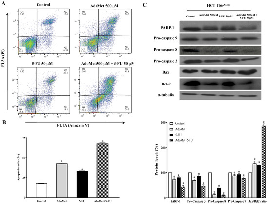Effect of AdoMet, 5-FU and their combination on apoptosis in HCT 116p53+/+ cells. (A) Cells were treated with 5-FU 50 µM for 24 h with and without 48 h pretreatment with 500 µM AdoMet. Apoptosis was then evaluated by FACS analysis. Representative dot plots of both Annexin V-FITC and PI-stained cells. The different quadrants show the percentage of cells: viable cells, lower left (Q4); early apoptotic cells, bottom right (Q3); late apoptotic cells, top right (Q2); nonviable necrotic cells, upper left (Q1). For each sample, 2 × 104 events were acquired. Analysis was carried out by triplicate determination of at least 3 separate experiments. (B) The histogram plot shows, for each single treatment, the percentage of apoptotic cells in the Q2 and Q3 quadrants. Data represent the average of three independent experiments. (C) The protein levels of PARP-1, pro-caspase 9, pro-caspase 8, pro-caspase 3, Bax, and Bcl-2 were detected by Western blot analysis using the total cell lysates. The house-keeping protein α-tubulin was used as loading control. The graph reports the relative densitometric analyses expressed as percentage of untreated control (100%). Error bars represent the standard deviation. * p < 0.05 versus untreated cells. The images are representative of three immunoblotting analyses obtained from three independent experiments. Full-length blots are shown in Figure S1.