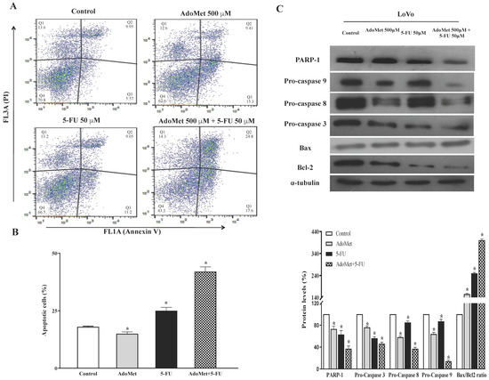 Effect of AdoMet, 5-FU and their combination on apoptosis in LoVo cells. (A) Cells were untreated with 5-FU 50 µM for 24 h with and without 48 h pretreatment with 500 µM AdoMet. Apoptosis was then evaluated by FACS analysis. Representative dot plots of both Annexin V-FITC and PI-stained cells. The different quadrants report the percentage of cells: viable cells, lower left (Q4); early apoptotic cells, bottom right (Q3); late apoptotic cells, top right (Q2); nonviable necrotic cells, upper left (Q1). For each sample, 2 × 104 events were acquired. Analysis was carried out by triplicate determination of at least 3 separate experiments. (B) The histogram plot shows, for each single treatment, the percentage of apoptotic cells in the Q2 and Q3 quadrants. Data represent the average of three independent experiments. (C) The protein levels of PARP-1, pro-caspase 9, pro-caspase 8, pro-caspase 3, Bax, and Bcl-2 were detected by Western blot analysis using the total cell lysates. The house-keeping protein α-tubulin was used as loading control. The graph reports the relative densitometric analyses expressed as percentage of untreated control (100%). Error bars represent the standard deviation. * p < 0.05 versus untreated cells. The images are representative of three immunoblotting analyses obtained from three independent experiments. Full-length blots are shown in Figure S1.