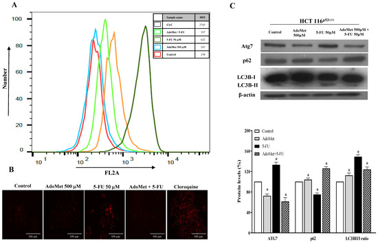 Effects of AdoMet, 5-FU, and their combination on the autophagic process in HCT 116p53+/+ cells. Cells were treated with 5-FU 50 µM for 24 h with and without pretreatment with 500 µM AdoMet for 24 h. Cells were then incubated with LTR and analyzed by flow cytometry (A) and fluorescence microscopy (B). Chloroquine was used as a positive control. For the quantitative evaluation of autophagy, the FlowJo software was used to calculate median fluorescence intensities (MFI) by the formula (MFI-treated/MFI-control). At least 2 × 104 events were acquired in log mode. Analysis was carried out by triplicate determination on at least three separate experiments. (C) The protein contents of Atg7, p62, and LC3B-II/I were detected by Western blot analysis using the total cell lysates. The house-keeping protein β-actin was used as loading control. The graph shows the relative densitometric analyses, expressed as percentage of untreated control (100%). Error bars represent the standard deviation, * p < 0.05 versus untreated cells. The images are representative of three immunoblotting analyses obtained from three independent experiments. Full-length blots are shown in Figure S2.