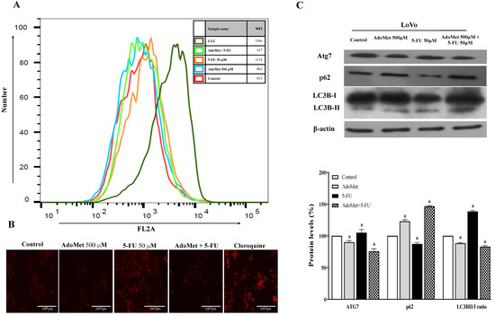 Effects of AdoMet, 5-FU, and their combination on the autophagic process in LoVo cells. Cells were treated with 5-FU 50 µM for 24 h with and without pretreatment with 500 µM AdoMet for 24 h. Cells were then incubated with LTR and analyzed by flow cytometry (A) and fluorescence microscopy (B). Chloroquine was used as a positive control. For the quantitative evaluation of autophagy, the FlowJo software was used to calculate median fluorescence intensities (MFI) by the formula (MFI-treated/MFI-control). At least 2 × 104 events were acquired in log mode. Analysis was carried out by triplicate determination on at least three separate experiments. (C) The protein contents of Atg7, p62, and LC3B-II/I were detected by Western blot analysis using the total cell lysates. The β-actin was used as loading control. The graph shows the relative densitometric analyses expressed as percentage of untreated control (100%). Error bars represent the standard deviation, * p < 0.05 versus untreated cells. The images are representative of three immunoblotting analyses obtained from three independent experiments. Full-length blots are shown in Figure S2.