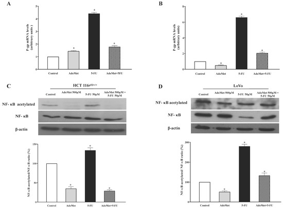 Effect of AdoMet and/or 5-FU on the levels of P-gp, NF-κB, and its acetylated form in HCT 116p53+/+ and LoVo cells. Cells were treated with 5-FU 50 µM for 24 h, with and without pretreatment with 500 µM AdoMet for 48 h. Total RNA was extracted and cDNA was synthesized by qRT-PCR. The graphs show the mRNA levels of P-gp in HCT 116p53+/+ (A) and LoVo (B) cells normalized to GAPDH mRNA. Data represent the average of three independent experiments. Western blot assay was used for the expression of NF-κB and acetylated NF-κB in HCT 116p53+/+ (C) and LoVo (D) cells, respectively. β-actin was used as loading control. Graphs show the relative densitometric analyses, expressed as percentage of untreated control (100%). Error bars represent the standard deviation, * p < 0.05 versus untreated cells. The images are representative of three immunoblotting analyses obtained from at least three independent experiments. Full-length blots are shown in Figure S3.