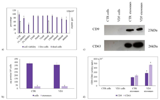 Figure 1. The effect of vitamin D3 on cell viability and exosome purification. (a) Left ordinate, effect of VD3 on HN9.10 cell viability (in gray). Cells were cultured with increasing doses of VD3 from 25 nmol/L to 400 nmol/L for 24 h and the viability was measured by MTT assay. Values were reported as percentage viability of the control sample (CTR). 1% DMSO and 2% DMSO were used as positive controls; right ordinate, live cells (in white) and dead cells (in light violet) under 100 nmol/L VD3 treatment evaluated by trypan blue exclusion assay; (b) Protein content in cells and exosomes; (c) Immunoblotting analysis of CD9 and CD63, as markers of exosome purification. The position of the 23 kDa for CD9, and 26 kDa for CD63 was evaluated in relation to the molecular-weight size markers. (d) The area density was quantified by Chemidoc Imagequant LAS500 by specific IQ programm. (case number:6) CTR, control sample; VD3, vitamin D3 sample. Data were expressed as mean ± SD of three independent experiments performed in duplicate. * p < 0.05 versus the control sample.