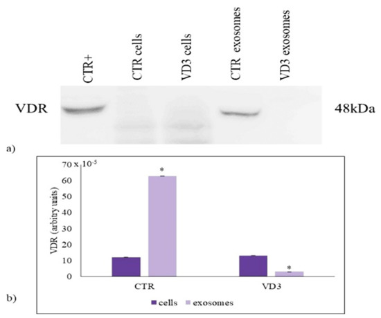 Figure 2. VDR content in cells and exosomes. (a) Immunoblotting analysis. The position of the 48 kDa was evaluated in relation to the molecular-weight size markers. NCI-N87 cells were used as positive control [17]; (b) The area density was quantified by Chemidoc Imagequant LAS500 by specific IQ programm. Data were expressed as mean ± SD of three independent experiments performed in duplicate (case number: 6). * p < 0.05 versus the control sample. CTR, control sample; VD3, vitamin D3 sample.