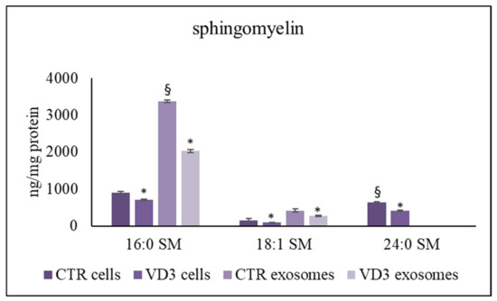 Figure 3. UFLC MS/MS analysis of SM species in cells and exosomes. The analysis was performed as reported in the Section 4. Data are expressed as ng/mg protein and represent the mean ± SD of three independent experiments performed in duplicate (case number: 6). * p < 0.05 versus the control sample, § p < 0.05 versus cells CTR, control sample; VD3, vitamin D3 sample.
