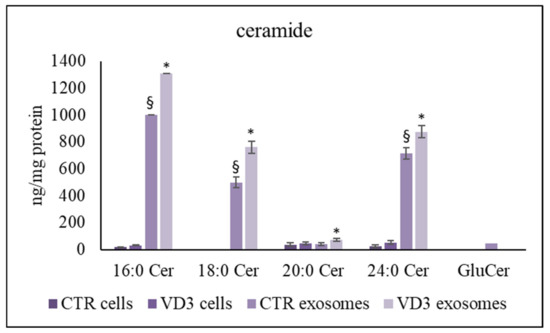 Figure 4. UFLC MS/MS analysis of ceramide species in cells and exosomes. The analysis was performed as reported in the Section 4. Data are expressed as nmol/mg protein. Data represent the mean ± SD of three independent experiments performed in duplicate (case number: 6). * p < 0.05 versus the control sample, § p < 0.05 versus cells Cer, ceramide; GluCer, glucosylceramide; CTR, control sample; VD3, vitamin D3 sample.