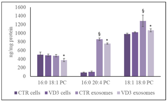 Figure 5. UFLC MS/MS analysis of phosphatidylcholine species in cells and exosomes. The analysis was performed as reported in the Section 4. Data are expressed as nmol/mg protein. Data represent the mean ± SD of three independent experiments performed in duplicate (case number: 6). * p < 0.05 versus the control sample, § p < 0.05 versus cells PC, phosphatidylcholine; CTR, control sample; VD3, vitamin D3 sample.