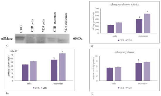 Figure 6. Neutral sphingomyelinase in cells and exosomes. (a) Immunoblotting analysis. The position of the 60 kDa was evaluated in relation to the molecular-weight size markers. HaCaT cells were used as positive control [19]; (b) The area density was quantified by Chemidoc Imagequant LAS500 by specific IQ programm. (c) Enzymatic activity of neutral sphingomyelinase. Data are expressed as nU/mg protein/min; (d) Neutral sphingomyelinase activity in relation to enzyme content. Data represent the mean ± SD of three independent experiments performed in duplicate (case number: 6). * p < 0.05 versus the control sample, § p < 0.05 versus cells, CTR, control sample; VD3, vitamin D3 sample.