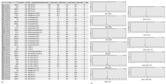 Figure 8. (a) Table showing lipidomic data analysis. main transitions decimal (Q1, parent ion; Q2 daughter ions. Retention times (RT); molecule name (ID); declustering potential (DP); entrance potential (EP); collision cell entrance potential (CEP); collision energies (CE); collision cell exit potential (CXP). RT (min); DP, EP, CEP, CE and CXP (V). (b) molecules under study.