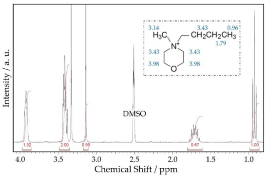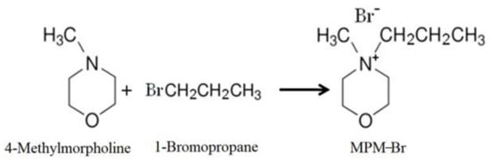 | N-ethyl-N-methylmorpholinium bromide | ![]() | 4-methylmorpholine, bromoethane, acetonitrile | 65 | 5 h | Yes | N2 | Yes | 1–3 M | [15,16] |
