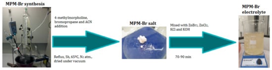 - Poon, G.; Parasuraman, A.; Lim, T.M.; Skyllas-Kazacos, M. Evaluation of N-ethyl-N-methyl-morpholinium bromide and N-ethyl-N-methyl-pyrrolidinium bromide as bromine complexing agents in vanadium bromide redox flow batteries. Electrochim. Acta 2013, 107, 388–396. [Google Scholar] [CrossRef]