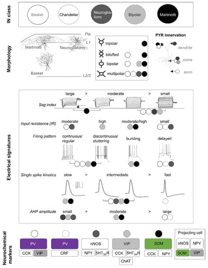 Historically, cell classes were derived based on three main electrophysiological features: (1) action potential discharge pattern, (2) single spike kinetics, and (3) passive membrane properties (resting membrane potential, input resistance, and cell capacitance). Based on firing patterns, all cortical INs can be assigned to one of four parent categories with each consisting of multiple subordinate groups. The parent categories distinguish cortical INs that respond to a suprathreshold depolarising current pulse with (1) continuous (or regular), (2) discontinuous (or stuttering), (3) burst-spiking, or (4) a delayed action potential discharge behaviour (Figure 1). The subordinate categories further distinguish between adapting, accommodating, irregular spiking, or accelerating IN types []. Furthermore, some INs are characterised by a low-threshold spike []. In contrast to the classification scheme based on morphological data, electrophysiological classification is associated with a high degree of variability and most morphological types show diverse action potential firing patterns. Nonetheless, a delayed action potential discharge pattern upon just suprathreshold current injection is typically associated with neurogliaform cells. Unfortunately, a similar correlation is not possible for most other IN types: however, basket cells and chandelier cells can best be characterised by their fast single spike kinetics and low input resistances (Figure 1). In contrast, Martinotti and bipolar cells exhibit intermediate single spike kinetics and moderate to high input resistances. In addition, analysis of the current–voltage relationship in morphological IN types reveals that large sag indices are typically observed in Martinotti cells. Therefore, the combined analysis of firing patterns [] with other electrophysiological features such as intrinsic membrane properties, current–voltage relationships, single spike kinetics, and afterhyperpolarisation properties helps to sharpen the segregation of specific IN subtypes. Ideally, analysis of these properties should be combined with an analysis of pre and postsynaptic assessment for each morphological cell type.