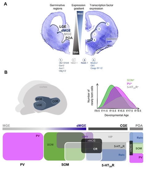 Given the graded expression of morphogens and transcription factors or combinations thereof, the germinative regions of the ganglionic eminences and of the preoptic area obtain regional identity and mostly produce distinct IN types. The MGE mainly gives rise to PV+ and SOM+ INs, whereas the CGE generates the majority of 5-HT3AR+ INs (Figure 3B). In contrast, the POA produces a diverse group of cortical INs comprising, amongst others, PV+, SOM+, and VIP+ INs [] (Figure 3B). Furthermore, transplantation of fluorescently labelled dMGE precursors resulted in grafted cells predominantly adopting a SOM+ IN phenotype []. This indicated that most SOM+ INs are generated from the dorsal aspect of the MGE (dMGE), whereas the MGE produces PV+ INs []. Fate-mapping studies further revealed that SOM+ INs coexpressing CR are preferentially generated in the dMGE, whereas those coexpressing NPY are primarily produced in the MGE []. As mentioned earlier, CGE-derived INs can further be subdivided into VIP+ or non-VIP Reln+ INs, both of which can coexpress nNOS and/or NPY [,] (Figure 3B).