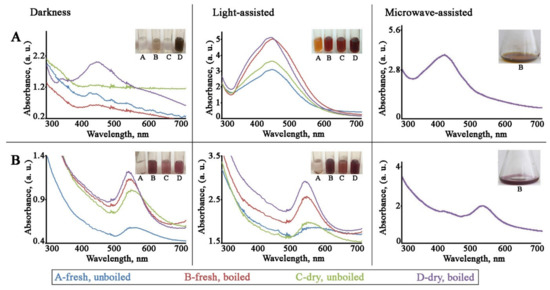 Another important factor to consider during the optimization of metal nanoparticles production is microwave irradiation. We tested the potential for microwave heating to intensify silver and gold ion reduction in the presence of dry and boiled L. erythrorhizon extract. Indeed, microwave treatment for 5 min led to a rapid change of solution, from colorless to yellowish-brown and red wine colors for silver and gold precursors, respectively (Figure 1). However, the productivity of these reactions was compatible with prolonged incubation (for AuNPs), or even lower (for AgNPs). These results indicate that microwave-assisted synthesis has an advantage in terms of the procedure time needed to obtain gold nanostructures, but light irradiation is a more important physical factor than heating for the reduction of precursor ions in the case of AgNP formation. Literature reports have revealed the positive effect of microwave irradiation on the synthesis of metal nanoparticles in both green and chemical approaches. Thus, microwave treatment favored the effective biosynthesis of AgNPs using Epicoccum nigrum and Theobroma cacao extracts [84,85]. Microwave irradiation also significantly promoted the synthesis of both AgNPs and AuNPs mediated by eosin-methylene blue agar [86]. Moreover, microwave irradiation was sufficient for the preparation of stable AgNPs without the addition of reducing molecules [87].