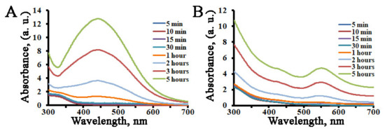 To investigate the reduction of silver and gold ions as a function of time, fresh and boiled extracts of L. erythrorhizon callus culture were mixed with the corresponding metal ion solution, and the formation of AgNPs and AuNPs was monitored using UV-Vis spectral analysis (Figure 2). In the case of AuNPs, the color of the solution was yellow, and it changed rapidly into a red color within a few minutes of callus extract addition. However, in the case of AgNPs, it took at least 1 h to transform the colorless reaction medium to a pale yellow-brown. It took only 5 h to complete the reduction of both silver and gold ions, and there was no significant change afterwards. No significant shift of the absorption maximums was recorded during the period of incubation. Similar dynamics in color changes were reported previously for AgNPs produced using extracts from Solanum xanthocarpum, Artemisia turcomanica, Gleichenia pectinata, and Spirogyra varians [88,89,90,91].