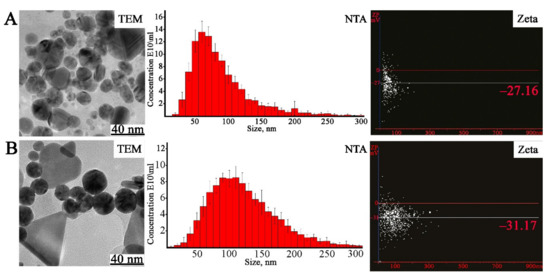 Analysis of AgNPs (A) and AuNPs (B) synthesized with L. erythrorhizon callus extract. TEM—transmission electron microscopy images of AgNPs and AuNPs; NTA—nanoparticle tracking analysis; Zeta—measurement of electric potential using NTA.