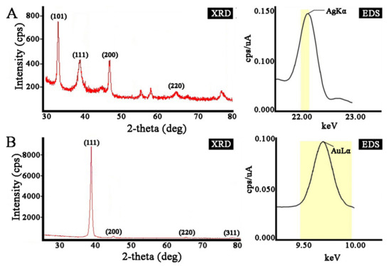 To verify the crystalline nature of the prepared nanoparticles, we used X-ray diffraction (XRD) analysis (Figure 4). The diffraction peaks of AgNPs at the 2θ values 38.18°, 44.12°, and 64.55° corresponded to the (111), (200), and (220) lattice planes of a face-centered cubic (fcc) structure, respectively. The corresponding d-spacing values of the AgNPs were 2.36, 2.05, and 1.44, respectively. The diffraction pattern corresponded to almost pure silver metal powder. Similarly, the diffraction peaks at the 2θ values 38.24°, 44.48°, 64.71°, and 77.70° corresponded to the (111), (200), (220), and (311) Bragg reflection planes of an fcc structure, respectively, for the Au metallic structure. The d-spacing values of the XRD lines of the AuNPs were 2.35, 2.04, 1.44, and 1.23, respectively. Our data matched with the silver card no. 04-0783 and gold card no. 04-0784 from the database of the Joint Committee on Powder Diffraction Standards (JCPDS). The average grain sizes of the AgNPs and AuNPs formed in our experiments were determined using Scherr’s formula and were estimated to be 8 nm and 14 nm for AgNPs and AuNPs, respectively. The composition of the crystals was further evaluated using energy dispersive X-ray (EDX) analysis, which provided evidence that they consisted of silver and gold without additional impurities (Figure 4). Overall, the obtained results illustrate that the silver and gold ions had indeed been reduced to Ag0 and Au0 by components of the L. erythrorhizon callus culture extract under the reaction conditions. The characterization data of these biologically synthesized NPs conformed to those reported earlier by different authors [59,63,67].