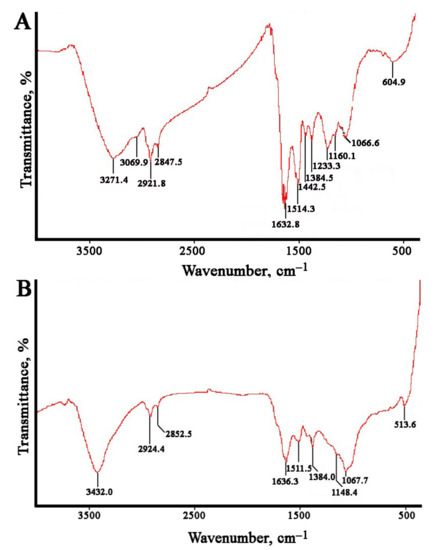 The Fourier-transformed infrared (FTIR) spectroscopy measurements were carried out to estimate the possible biomolecules participating in reduction and stabilization of the metal nanoparticles mediated by the L. erythrorhizon callus extract (Figure 5). The FTIR spectra of AgNPs showed characteristic peaks at 3271, 3069, 2921, 2847, 1632, 1514, 1442, 1384, 1233, 1160, 1066, and 604 cm−1. The AuNPs showed similar peaks at 3432, 2924, 2853, 1636, 1511, 1384, 1148, 1068, and 513 cm−1. Large O-H and C-H stretches obtained for silver (3271, 3069, 2921, and 2847 cm−1) and gold (3432, 2924, 2853 cm−1) nanoparticles are usually attributed to polysaccharides adsorbed on the nanoparticle surface. These bands are also characteristic of the aromatic C-H stretch and O-H stretching of the phenol groups and the carboxylic group [96]. This region also includes N–H stretching vibrations of the amide A and B bands in proteins [97]. In both types of nanoparticles, the main bands were located between 1700 and 1000 cm−1. The bands at 1632, 1514, and 1442 cm−1 for the AgNPs and those at 1636 and 1511 cm−1 for the AuNPs were due to the presence of aromatic rings in the molecule, indicating aromatic ring stretching [98,99]. The peak at 1384 cm−1 was attributed to COO− stretching and CH3 bending vibrations of lipids and proteins [64]. The absorption bands at 1148–1160 cm−1 were mainly attributed to the hydrogen and non-hydrogen bonds of C-O stretching in polysaccharides [100]. In AgNPs, the sample band at approximately 1233 cm−1 could be associated with the asymmetric PO2− vibration in DNA molecules [101]. The peak at 1067–1068 cm−1 was due to the stretching vibrations of C–O–C and C–O bonds in polysaccharides [102]. The remaining bands in the region 600−500 cm−1 may have been due to CH out-of-plane bending vibrations of some organic material associated with biosynthesized nanoparticles [102]. Thus, the FTIR spectra of the monometallic nanoparticles showed peaks indicating the presence of polyphenolic compounds, proteins, and polysaccharides from L. erythrorhizon callus extract, suggesting that they are involved in the synthesis and stabilization of biogenic nanoparticles. These findings are consistent with data on the biosynthesis of AgNPs and AuNPs using extracts of piper [96], industrial hemp [103], and mint [104].