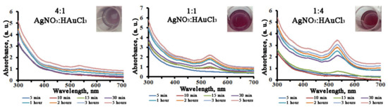 As L. erythrorhizon callus extract was capable of promoting monometallic nanoparticle formation, we tested its ability in the production of bimetallic nanocrystals with molar silver/gold ratios of 4:1, 1:1, and 1:4. The biosynthesis of bimetallic Ag/Au NPs after the addition of L. erythrorhizon callus extract could be followed by a color change from yellow to ruby red (Figure 6) and, further, as a function of reaction time, by UV-Vis spectroscopy for 5 h to complete the reduction of the precursor ions (Figure 6). It was noted that the rate increase of the AuNPs’ SPR band (λmax = 545 nm) was much higher than that of the AgNPs’ SPR band (λmax = 440 nm). Consequently, the AgNPs’ absorbance peak was not visible, even in the Ag/Au (4:1) NPs’ co-reduction mixture. The type of UV-Vis spectra obtained, showing mainly one well-distinguishable SPR peak positioned at the same wavelength as the AuNPs, indicated that the prepared bimetallic NPs may have had a core-shell structure with gold on their shells.