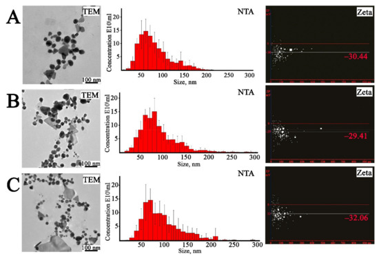 Analysis of bimetallic Ag/Au NPs synthesized with L. erythrorhizon callus extract. TEM—transmission electron microscopy images; NTA—nanoparticle tracking analysis; Zeta—measurement of electric potential using NTA. (A)—Ag/Au (4:1) NPs, (B)—Ag/Au (1:1) NPs, (C)—Ag/Au (1:4) NPs.