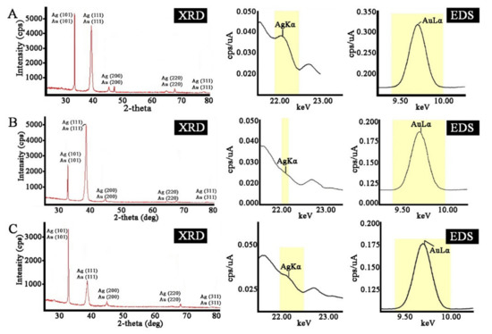 X-ray diffraction (XRD) and energy dispersive X-ray (EDX) analysis of bimetallic Ag/Au NPs synthesized with L. erythrorhizon callus extract. (A)—Ag/Au (4:1) NPs, (B)—Ag/Au (1:1) NPs, (C)—Ag/Au (1:4) NPs.