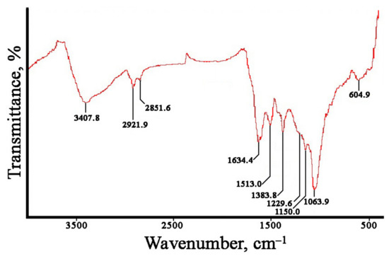 The FTIR spectra of bimetallic Ag/Au NPs with a 1:1 ratio showed characteristic peaks at 3408, 2922, 2851, 1634, 1513, 1384, 1230, 1064, and 605 cm−1. A typical spectrum is shown in Figure 9, and there were no differences between bimetallic nanoparticles with other atomic ratios. It can be noted that the FTIR spectra of Ag/Au NPs resembled those of individual AgNPs and AuNPs synthesized with L. erythrorhizon callus extract (Figure 5). In particular, the absorption bands at 3407.8 and 1229.6 cm−1 were similar to those obtained in AgNPs. Peaks at 1150.0 and 604.9 were characteristic of AuNPs. Other transmittance bands could be attributed to both types of metallic NPs. Thus, our results show that phytochemicals, such as carbohydrates and polyphenolics, as well as proteins, to some extent, play a role in the biological reduction of bimetallic nanoparticles.