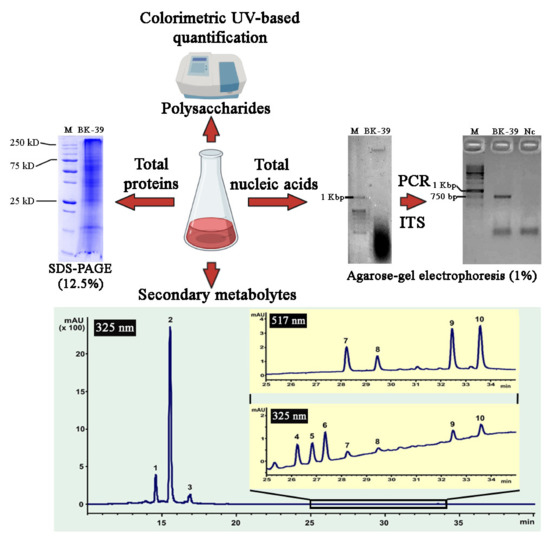 In order to evaluate the roles of the water-soluble molecules, such as nucleic acids, proteins, polysaccharides, and secondary metabolites, of L. erythrorhizon callus extract in the nanoparticle formation, we analyzed their content and reduction potential in relation to silver ions. Concentrations of nucleic acids, proteins, and polysaccharides were determined using spectrophotometric methods, as described in the Materials and Methods section. DNA/RNA molecules were the least abundant compounds of the extract (Figure 10 and Figure 11). To test the integrity of the DNA sample, a polymerase chain reaction (PCR) was performed with a primer set specific for the plant internal transcribed spacer of nuclear ribosomal DNA. This experiment allowed us to confirm that the L. erythrorhizon extract contained PCR-compatible DNA as soon as a PCR product of the predicted length was obtained (Figure 10). Proteins presented in the extract of L. erythrorhizon were analyzed using polyacrylamide gel (PAGE) electrophoresis and the Bradford assay. PAGE electrophoresis revealed that the extract contained a considerable number of proteins that were partially degraded (Figure 10). The Bradford protein assay confirmed the presence of proteins in relatively high concentrations (Figure 11). The polysaccharide fraction extracted from L. erythrorhizon was the most abundant, as estimated using the phenol-sulfuric acid method (Figure 11). Thus, our results indicated that the main macromolecule presented in the extract was the polysaccharide.