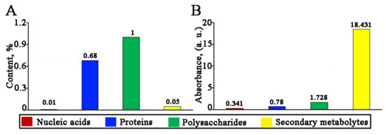 The relative content of nucleic acids, proteins, polysaccharides, and secondary metabolites in L. erythrorhizon callus extract (A) and their reducing activity with respect to silver ions (B).
