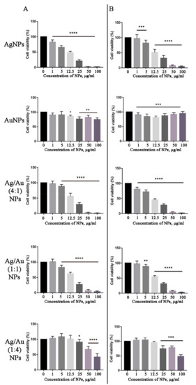 The in vitro cytotoxicity of biosynthesized metal nanoparticles was evaluated against mouse neuroblastoma (N2A) and embryonic fibroblast (NIH 3T3) cell lines using the MTT assay. In most cases, the nanoparticles were able to reduce the viability of the N2A and NIH 3T3 cells in a dose-dependent manner, as shown in Figure 12. In particular, treatment of 3T3 and N2A cultures with bimetallic Ag/Au (1:4) and Ag/Au (1:1) NPs did not induce cell death at 1 μg/mL concentration, but significantly (p < 0.0001) decreased cell viability at 5 μg/mL and higher doses (Figure 12). Interestingly, under the tested conditions, AgNPs and Ag/Au (4:1) NPs demonstrated the highest cytotoxic effect in both studied cell lines (Figure 12). No significant differences were found in the toxicity of biosynthesized NPs in neuroblastoma and embryonic fibroblast cells. AuNPs possessed the lowest cytotoxicity among the tested NPs (Figure 12). It was previously reported that treatment of MCF7, A549, and Hep2 cell lines with AgNPs, synthesized using Beta vulgaris extract, showed a decrease in cell viability with increasing concentrations of AgNPs [124]. The same results were demonstrated when AgNPs obtained with leaf extract of Andrographis echioides were studied against MCF7 breast cancer cells [125]. Botha et al. reported that AgNPs and Ag/Au bimetallic nanoparticles, synthesized using Solidago canadensis plant extract, showed high toxicity to H4IIE-luc (rat hepatoma) and HuTu-80 (human intestinal) cells, while AuNPs of the same origin were not toxic [118]. Similarly, the Deinococcus radiodurans protein extract-mediated AuNPs showed low cytotoxicity against the normal epithelial cells [126]. Interestingly, bimetallic Ag/Au (3:1) NPs synthesized with a chemical reduction had the maximal cytotoxicity effect in cancer cells, compared with Ag/Au (1:1) and (1:3) NPs [127]. Moreover, their toxicity in non-cancerous cell lines was less pronounced and this cell-specific effect was mediated by an excess of tryptophan, which increased the selective toxicity of nanoparticles.