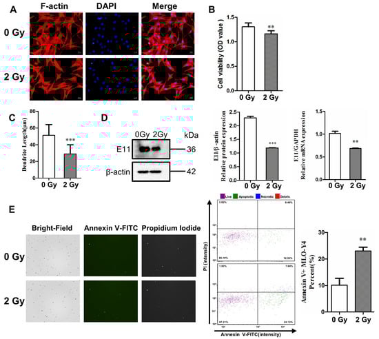 The F-actin fluorescence staining results show that most of the irradiated MLO-Y4 cells exhibited obvious morphological changes, including a polygonal shape and shortened dendrites compared to the control group. The dendrite length of MLO-Y4 was also quantified, and it was found to have shortened by 40.3% on average under 2 Gy irradiation, with a significant difference (*** p < 0.001; Figure 1C). To further investigate the inhibitory effect of radiation on dendrite elongation, we examined the mRNA and protein expression of E11, which is a dendrite marker in osteocytes. The level of E11 mRNA in MLO-Y4 cells was downregulated after irradiation (** p < 0.01; *** p < 0.001; Figure 1D). Meanwhile, cell viability was determined with a CCK-8 assay. The survivability of MLO-Y4 cells decreased 3 days post irradiation (** p < 0.01; Figure 1B), which proved the direct deterioration effect of irradiation on osteocytes.