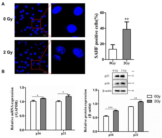 The destruction of chromatin structure in the nucleus, disruption of nuclear integrity, and formation of senescence-associated heterochromatic foci (SAHF) were observed by DAPI staining, thus confirming that radiation could induce structural changes in chromatin to form SAHF, which is a typic marker of senescent cells. According to the results, in the control group, the number of SAHF-positive cells accounted for 13.16%, while in the 2 Gy irradiation group, the number of SAHF-positive cells accounted for 38.79%, with a statistically significant difference (** p < 0.01; Figure 2A). After irradiation-induced senescence in osteocytes, the protein and gene expression of p16 and p21 (which are senescence-related genes and proteins) were highly upregulated after 2 Gy irradiation in MLO-Y4 cells (* p < 0.05; ** p < 0.01; *** p < 0.001; Figure 2B). Furthermore, it was found that irradiation could enhance the accumulation of γ-H2AX in osteocytes, a marker of DNA double-strand breaks. Compared to the control group, the percentage of γ-H2AX-positive cells was increased by 35.47% in the 2 Gy-irradiated group (* p < 0.05; Figure 2C).