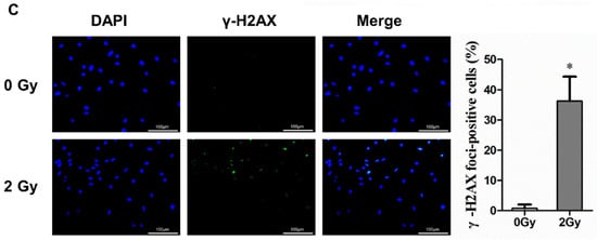 Immunofluorescence detection for γ-H2AX foci: We used an immunofluorescence assay to detect γ-H2AX foci, a marker of DNA damage. The γH2AX foci were tested according to the previous description [], and then the γ-H2AX foci number was quantified with a Leica fluorescence microscope (Leica Microsystems, Wetzlar, Germany).