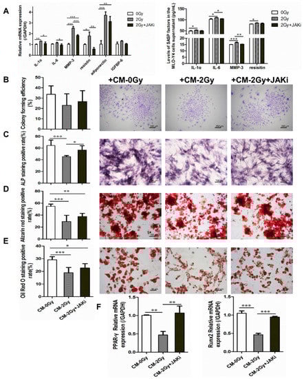 Furthermore, the influence of irradiated osteocytes on the colony-formation ability and multidirectional differentiation potential of BMSCs was investigated. The capacity of cell colony formation was mildly disrupted under CM- 2 Gy co-culture. Meanwhile, it was also shown that the potential for both the osteogenic and adipogenic differentiation of BMSCs co-cultured with CM- 2 Gy was significantly decreased. Compared to the control group, the areas of positive alkaline phosphatase, mineralized nodules stained with Alizarin Red S, and lipid droplets stained with Oil Red O were significantly reduced. More interesting is that when 0.8 μM JAK1 inhibitor was added to the irradiated MLO-Y4 cells in order to block SASP secretion, the BMSC differentiation potential inhibition was alleviated to some extent (* p < 0.05; ** p < 0.01; *** p < 0.001; Figure 4B–E). Simultaneously, it was shown that osteogenic and adipogenic differentiation-related genes Runx2 and PPAR-γ were significantly reversed in BMSCs cultured in the CM- 2 Gy+JAKi, which showed a consistent downward trend (** p < 0.01; *** p < 0.001; Figure 4F). The above results verify that senescent osteocytes can perturb BMSCs via a paracrine pathway of SASP.