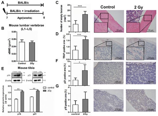 Radiation-induced bone tissue damage and aging. (A) Experimental design to test radiation-induced bone tissue senescence in mice. Effect of whole-body 2 Gy irradiation on aging-related bone loss. Seven week-old male BALB/c mice were randomized to receive a single 2 Gy irradiation (n = 10) or no irradiation (n = 10). The terminal observation time of the experiment was 7 days post irradiation. (B) Effect of single 2 Gy irradiation on the areal bone mineral density (aBMD) of the lumbar spine in mice; n = 8. (C) Effect of single 2 Gy irradiation on osteocyte lacunae in mice after 7 days; magnification = ×200, n = 6. (D) Effect of single 2 Gy irradiation on TRAP expression in mouse bone tissue after 7 days; magnification = ×40, n = 6. (E) The expression of senescence-related genes and proteins p21 and p16 in bone tissue was examined by Western blot analysis; n = 3. (F,G) The expression of senescence-related proteins p21 and p16 in mouse bone tissue 7 days post irradiation; magnification = ×100, n = 5. Results are expressed as mean ± SD (* p < 0.05; ** p < 0.01; *** p < 0.001 vs. control).