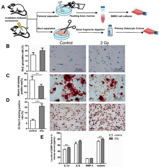 The pattern diagram briefly illustrates the femur (for BMSC isolation) and skull bones (for primary osteocyte isolation) isolated from mice (Figure 6A). Following this, bone marrow washed out of the femur was centrifuged and cultured to obtain BMSCs. Meanwhile, the skull bones were digested and cultured to obtain primary osteocytes (Figure 6A). To detect senescence markers in bone tissue, SA-β-gal-positively expressed cells in osteocytes were extracted from mouse skull bones (Figure 6B). To detect levels of SASP in mouse serum, we screened for IL-1α, IL-6, MMP3, and resistin via mouse cytokine array membrane analysis. ELISA results show that at 7 days after irradiation, the levels of IL-1α, IL-6, MMP3, and resistin in the serum of irradiated mice tended to increase compared to the control group (** p < 0.01; Figure 6E). The effects of radiation on bone formation were examined using extracted BMSCs to induce mineralized nodules and adipogenic differentiation in vitro. It was found that the in vitro mineralized nodule-formation ability of BMSCs was significantly decreased and the adipogenic-formation ability was significantly increased in the irradiated group (** p < 0.01; *** p < 0.001; Figure 6C,D).
