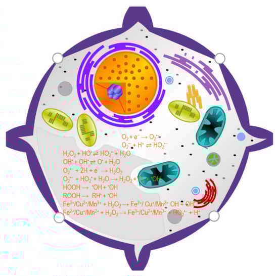 Reactive oxygen species produced in plants are composed of both free radicals and non-radicals [2,13]. The common cellular ROS radicals are O2•−, •OH, the perhydroxy radical (HO2•), peroxyl (RO2•), carbonate (CO3•−), semiquinone (SQ•−), the alkoxy radical (RO•) and the peroxy radical (ROO•). The non-radical ROS of plant cells are H2O2, 1O2, organic hydroperoxide (ROOH), ozone (O3), hypoiodous acid (HOI), hypobromous acid (HOBr) and hypochlorous acid (HOCl) (Figure 1; [2,24]).