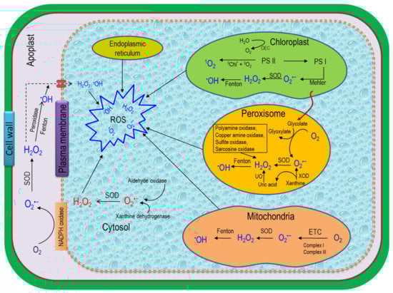 Reactive oxygen species are the byproduct of aerobic metabolism in different cell organelles such as chloroplasts, mitochondria, peroxisomes, plasma membranes and cell wall (Figure 3 [24,25]). A specific ROS generation in a cell is highly localized, and different pathways are intensively involved in this process [26,27]. For a better understanding of ROS scavenging tactics in different subcellular compartments, at first, it is obligatory to study the subcellular compartment-specific ROS generation in cells.