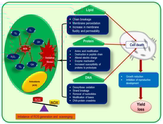 Overproduction of ROS disrupts the equilibrium between ROS accumulation and scavenging that ultimately damages different cellular biomolecules through protein oxidation, lipid peroxidation, enzyme inactivation, chl degradation and destruction of nucleic acids under stressful conditions (Figure 4; [8,13,41]). However, various factors influence the extent of biomolecular damage which include the concentration of the biomolecule(s), the location of the target biomolecule(s), the site of ROS generation and the reaction rate between the target biomolecule(s) and ROS [13].