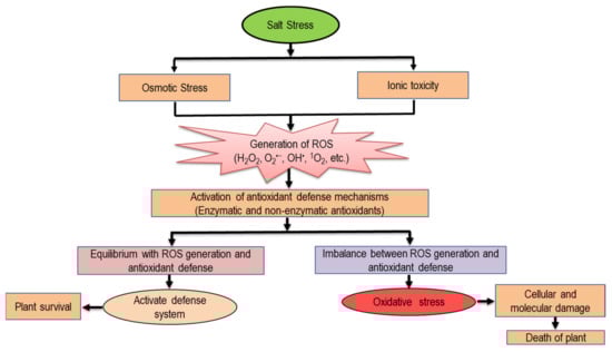 Abiotic stresses are closely associated with climate change, and they hamper the growth and development of plants; consequently, the yield and quality of crops are also negatively affected. Therefore, the sustainability of global agricultural production is threatened by abiotic stresses [1,2]. Salt stress is one of the detrimental abiotic stresses which greatly reduces crop growth and productivity [3]. Around the world, about 20–50% of irrigated land areas are affected by salt stress [4]. An increase in the salinity level in plant growing media leads to an increase in endogenous sodium (Na+) and chloride (Cl−) contents. Both Na+ and Cl− ions can create life-threatening conditions for plants, but between them, Cl− is more dangerous [5]. Salinity-induced osmotic stress, ionic stress and nutrient imbalance as well as their secondary effects altogether lead to the overgeneration of reactive oxygen species (ROS) [5,6].