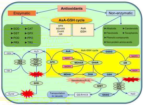 Plants have antioxidants that are employed in scavenging ROS by working in coordination with non-enzymatic antioxidants (ascorbate (AsA), GSH, phenolic compounds, flavonoids, alkaloids, α-tocopherol, non-protein amino acids, etc.) and enzymatic antioxidants (SOD, APX, CAT, DHAR, MDHAR, GPX, GR, GST, POD/POX polyphenol oxidase, PPO, PRX, thioredoxin (TRX), etc.), and that protect them from oxidative damage (Figure 7; [13,24]).