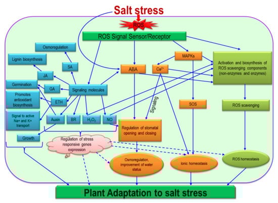 Salt stress directly induces primary stresses such as osmotic and ionic stresses as well as imposing secondary stresses such as oxidative stress caused by ROS. These ROS play a signaling function at a certain low concentration which is variable depending upon many factors [139]. In recent decades, research on salt stress signals and adaptation proposed different pathways which still remain hazy because of the complex interaction between and among biomolecules (Figure 8; [139,140,141]). Under salt stress, ROS production induces mitogen-activated protein kinase (MAP) cascades which mediates ionic, osmotic and ROS homeostasis [139,142].