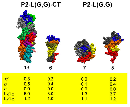 Selected ordered peptide aggregates formed in the P2-L(G,G)-CT (left) and P2-L(G,G) (right) peptide mixtures studied by MD simulation. Individual peptides in each aggregate (the total number of peptides presented below each complex) are here depicted as coloured van der Waals volumes. Yellow box contains calculated values for the shape descriptors investigated (relative shape anisotropy (κ2), asphericity (b), acylindricity (c) and the ratios of gyration tensors in the x, y and z dimensions (LX,Y,Z)).